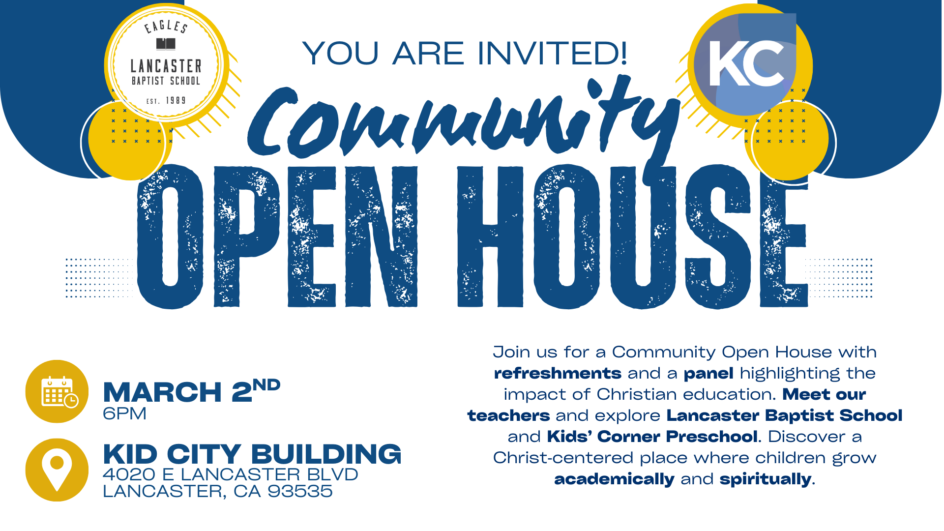 Join us for a Community Open House with refreshments and a panel highlighting the impact of Christian education. Meet our teachers and explore Lancaster Baptist School and Kids’ Corner Preschool. Discover a Christ‑centered place where children grow academically and spiritually.